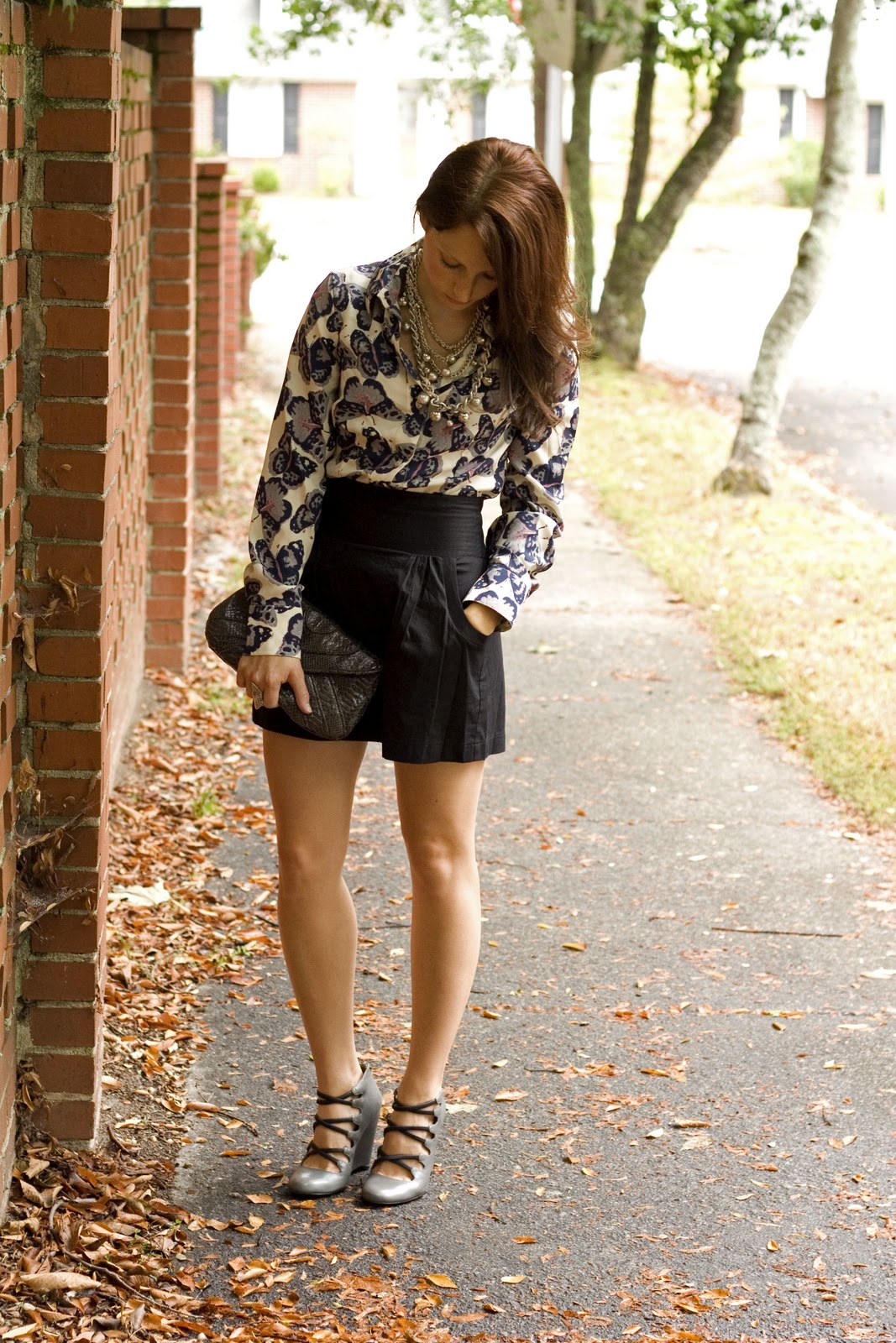 With temperatures steadily in the high sixties and low seventies, fall has finally arrived in the south. Long sleeved shirts, scarves, and cardigans have begun to make their way into my regular rotation, and I anxiously await the day when I can pull on a pair of tights (which may very well be tomorrow!). Among my wardrobe favorites for fall are wedges and silk shirts. Patterned, solid, bright, or subdued, silk button downs are a great way to add a bit of class to any outfit.